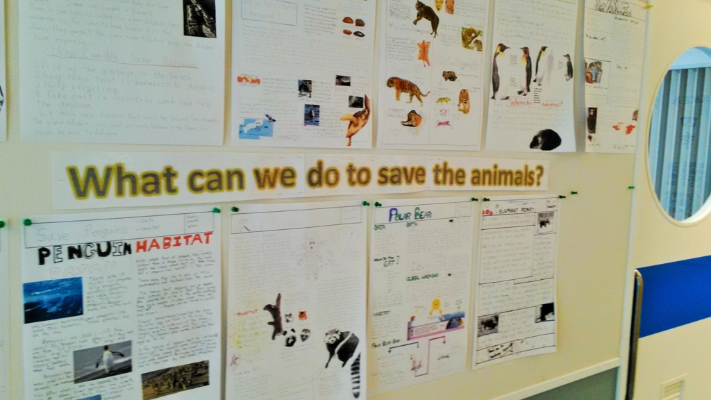理科室の前に貼り出されいてた子どもたちのレポート。もちろん英語で書かれています