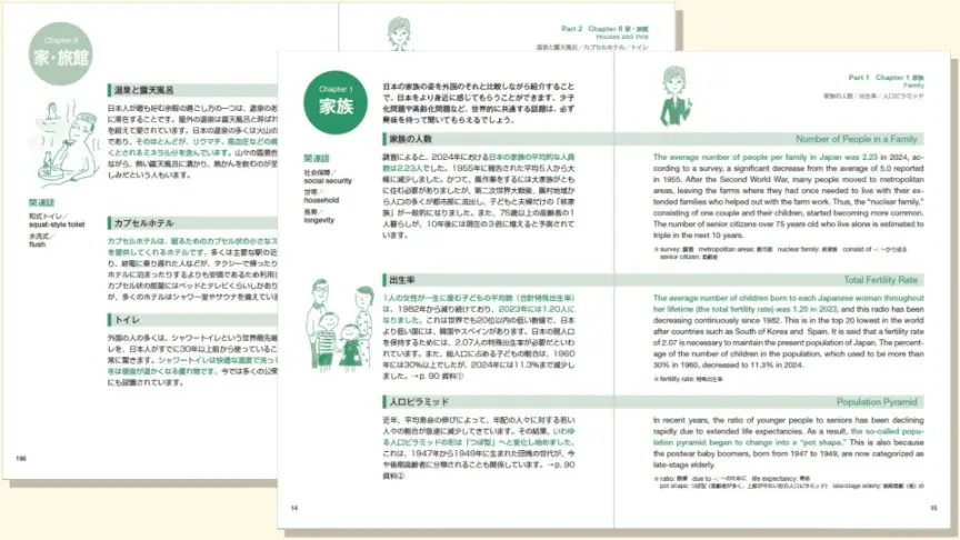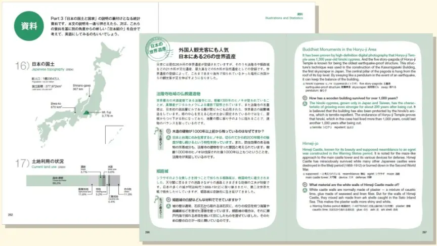 左ページに日本語の説明、右ページに英語と、見やすい対訳式になっています。簡潔な英語での核心を突いた説明の仕方が分かると同時に、統計データや豆知識を適宜盛り込むといった、興味を持って聞いてもらうための伝え方のコツも知ることができます。資料、最新データも満載