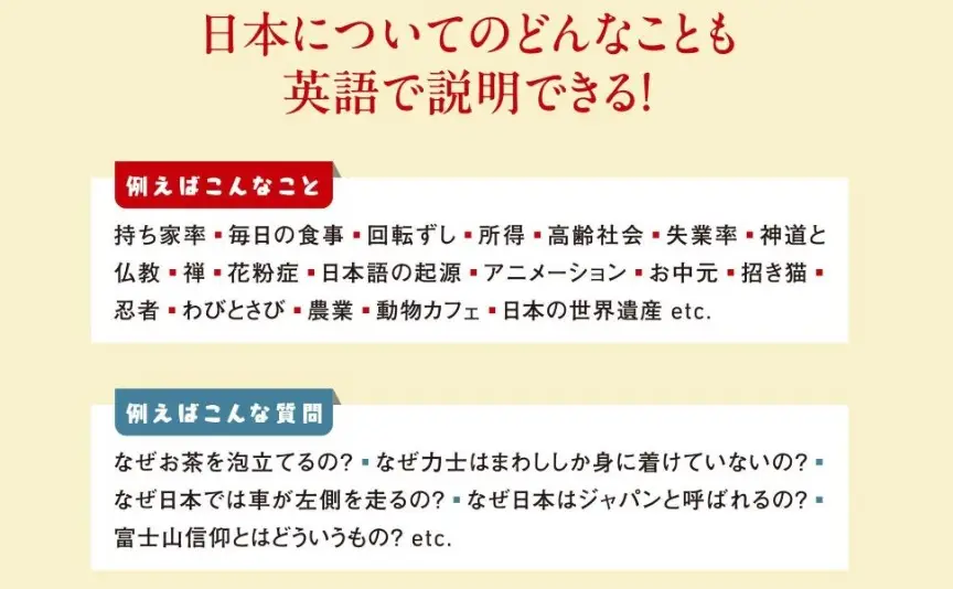 訪日旅行者の案内をしたい人、通訳ガイドのプロ・志望者、留学先などで日本について話す機会のある人はもちろん、外国の人に日本を正しく説明し好きになってもらいたいと願うすべての人のための1冊です。