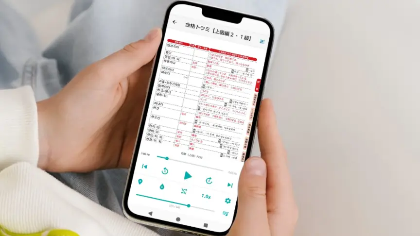 学習したい級のレベルを選んで「聞く」ボタンを押せば、ネイティブ音声の一覧が表示されます。再生ボタン(右向きの三角形)、もしくは聞きたいトラックを押して音声を聞いてください。再生速度の変更など、さまざまな機能も付いているので、ぜひ学習にお役立てください。