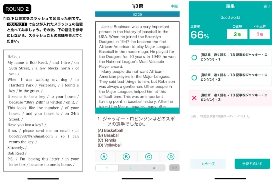 学習アプリ「 booco 」では、音声のダウンロードに加えてスラッシュリーディングに適した機能や自動採点のクイズ機能で効率的な学習を行えます。