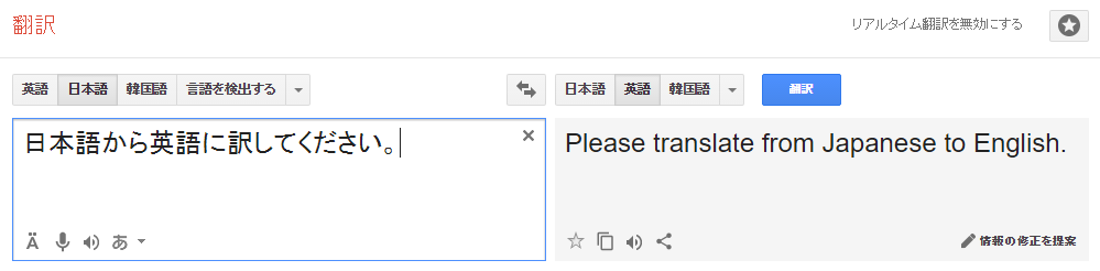自動翻訳サービスとしては、『Google翻訳』が有名です。使ったことがある人も多いと思いますが、試しにGoogle翻訳で日本語から英語に翻訳してみましょう。