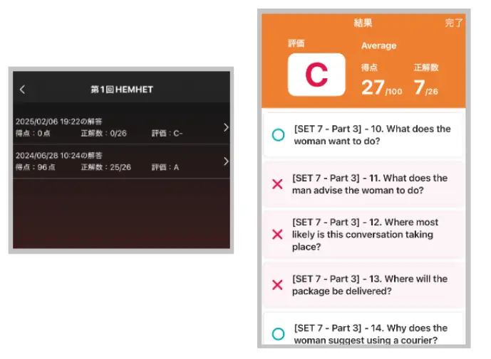 HEMHETでは受験するたびに「履歴」が付きます。それによって苦手な問題が明らかになり、「なぜ聞き取れなかったのか」「どこで迷ったのか」を確認しながら、パートや設問のタイプを絞ってピンポイント学習できます。隙間時間にいつでも学習でき、同じ問題を何度でも解き直せます。1回勝負の模試型教材より、弱点克服に向いているのです。