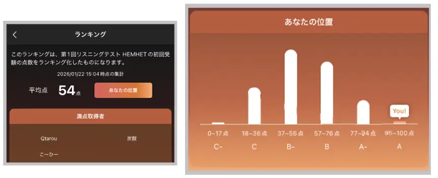 初回受験時に、全受験者のスコア分布の中で自分がどのレベル帯(C- / C / B- / B / A- / A)に位置しているかが可視化されます。自分の現在地を客観的に把握することで、次の目標を具体的に設定しやすくなり、学習継続のモチベーション向上につながります。