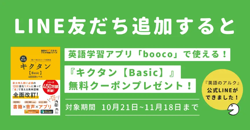 今なら、友だち追加いただいた方全員に、英語学習アプリ「booco」で使える『改訂第2版キクタン【Basic】4000語レベル』の無料クーポンをプレゼント中!